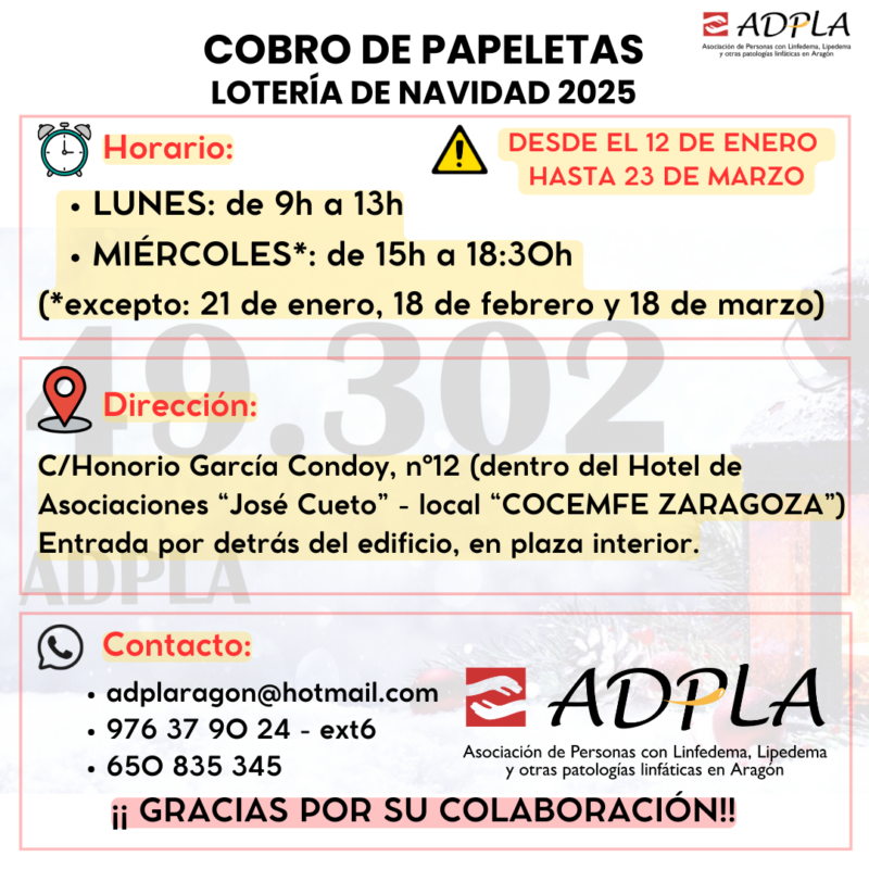 El premio se cobra en la SEDE DE ADPLA, a partir del 12 de enero, en el horario que a continuación exponemos: